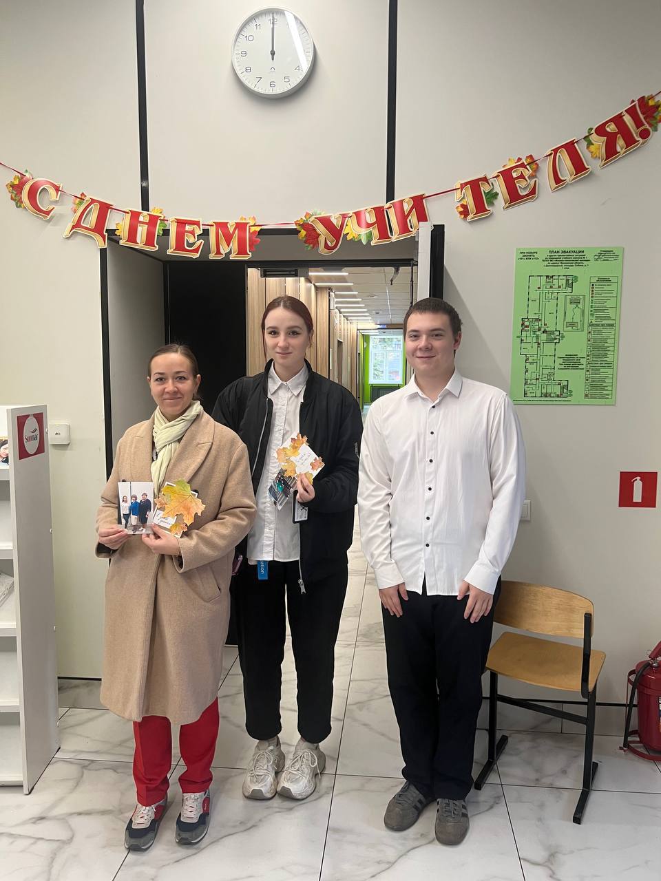 С самого утра ребята встречали преподавателей в обоих корпусах и дарили им сделанные своими руками открытки — так студенты выразили благодарность за ежедневный труд и поддержку своих наставников.