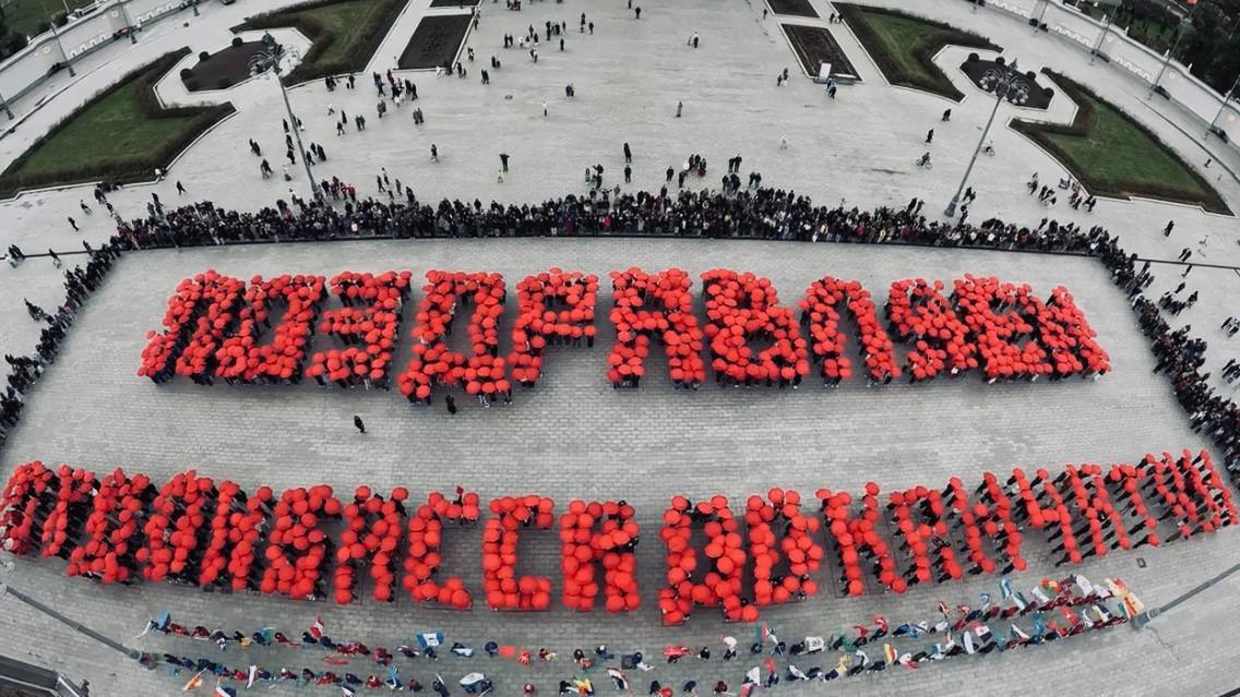 Вместе с тысячами участников из движений «Волонтёрская Рота» и «Молодая Гвардия» они прошли колонной по главной площади и выстроились в живую надпись: «Поздравляем от Донбасса до Камчатки».