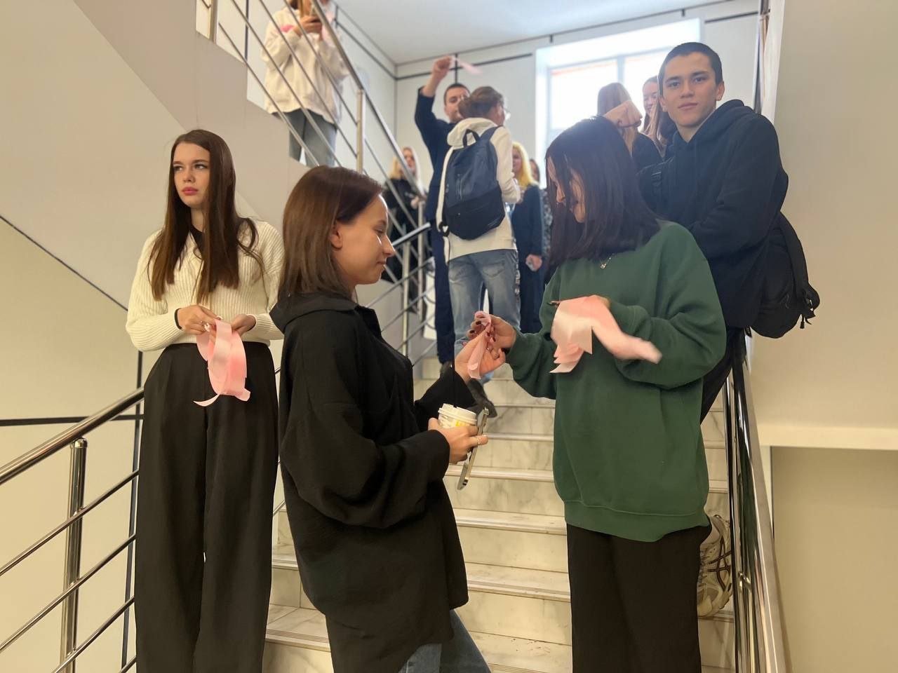 Студенты раздавали отрезки цветных ленточек, которые можно было повязать тому кто тебе нравится, симпатичен, кого ты уважаешь, с кем хочешь дружить, или просто тому, кому хочешь оказать внимание.