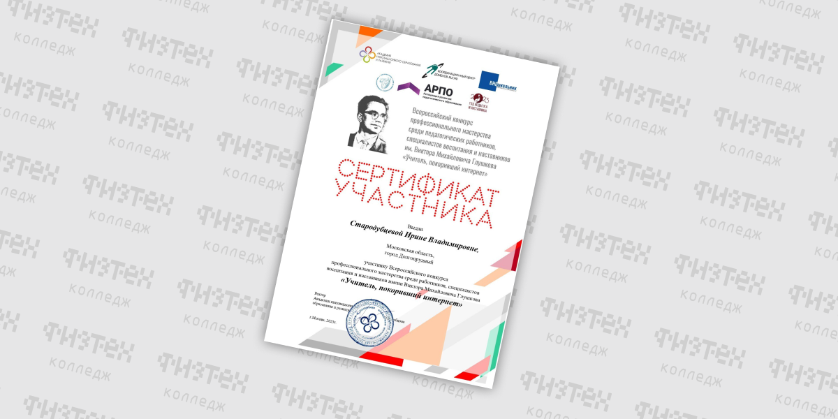 Педагог Физтех-колледжа Стародубцева И.В. приняла участие во Всероссийском конкурсе профессионального мастерства среди педагогических работников, специалистов воспитания и наставников им. Виктора Михайловича Глушкова «Учитель, покоривший интернет».