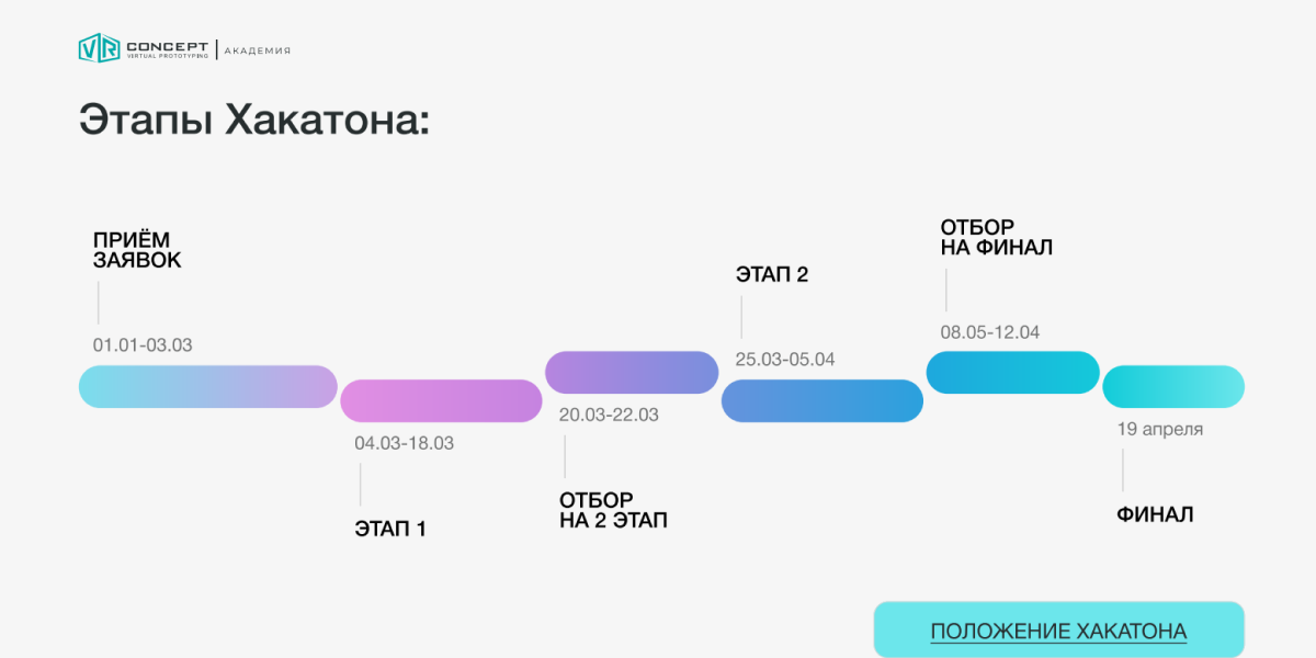 Хакатон пройдет с 3 марта по 19 апреля, заявки принимаются до 3 марта: https://hackathon.vrconcept.net/