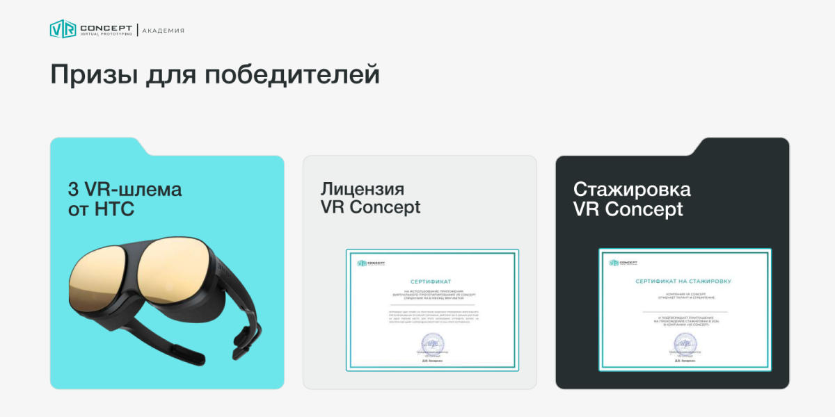 Победители Хакатона получат VR-шлемы, лицензию на использование VR Concept, а также призы от партнёров. Каждая команда получит возможность представить свой проект профессиональному жюри из экспертов индустрии. Лучшие команды будут приглашены на стажировку в VR Concept.