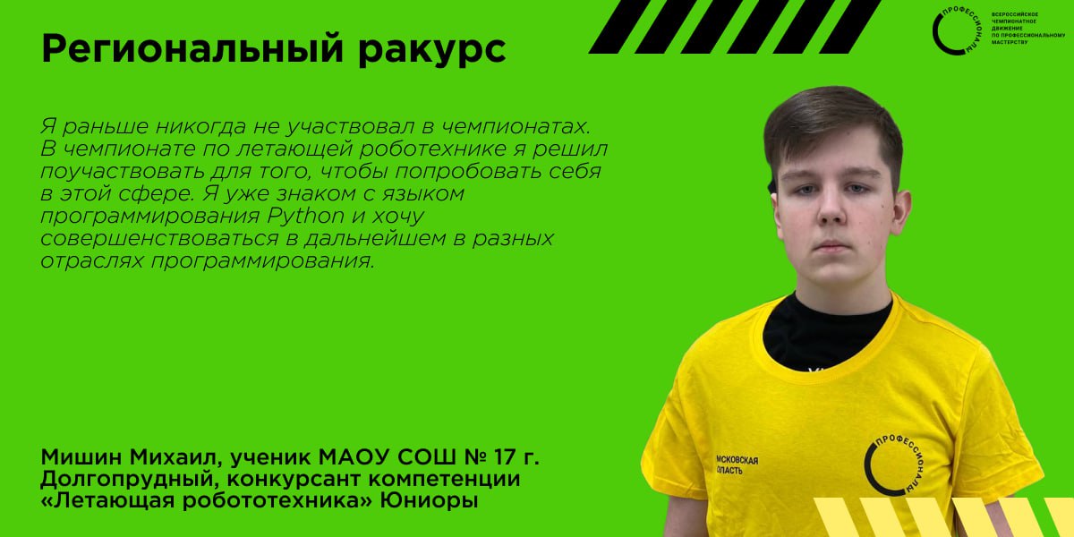 В рамках рубрики «Региональный ракурс» своей мотивацией делится конкурсант в компетенции «Летающая Робототехника» (Юниоры) - ученик школы МАОУ СОШ №17 г. Долгопрудный.