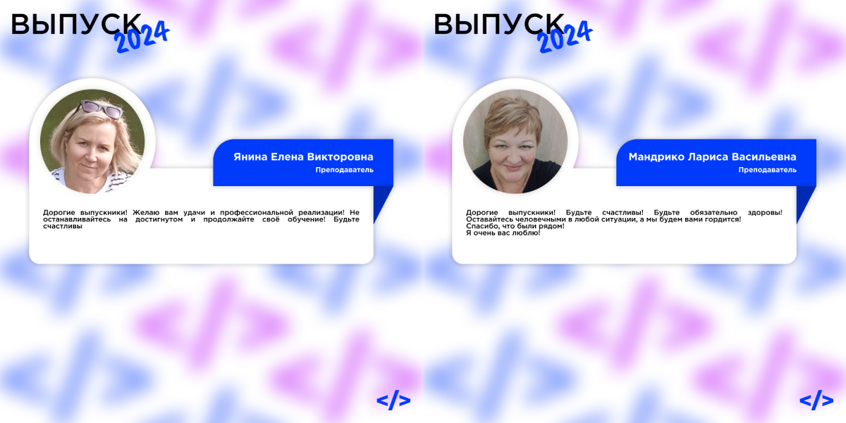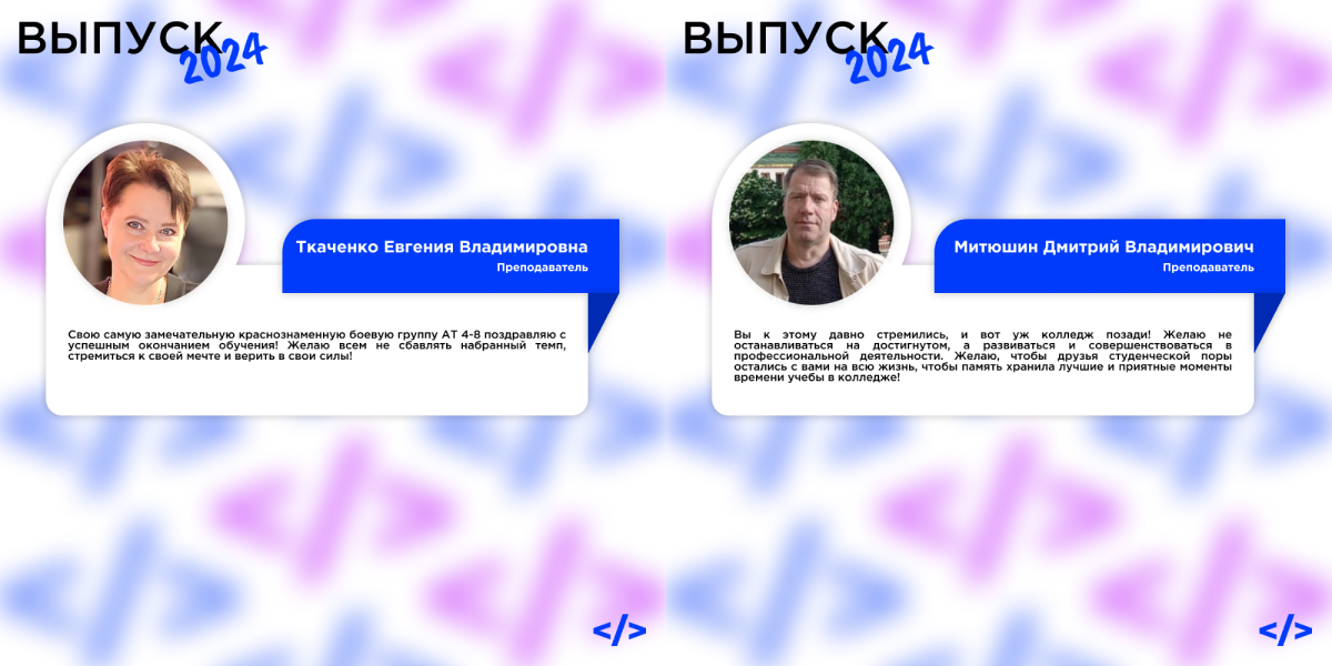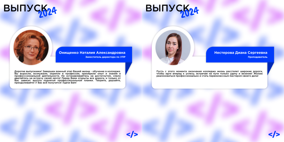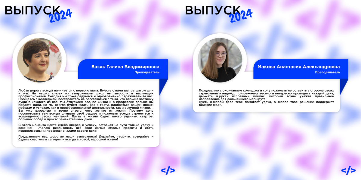 Поздравляем вас с успешным завершением обучения в колледже! Ваши старания и усердие привели вас к этому важному этапу в жизни. Мы гордимся вашими достижениями и уверены, что полученные знания и опыт помогут вам добиться успеха в выбранной профессии!