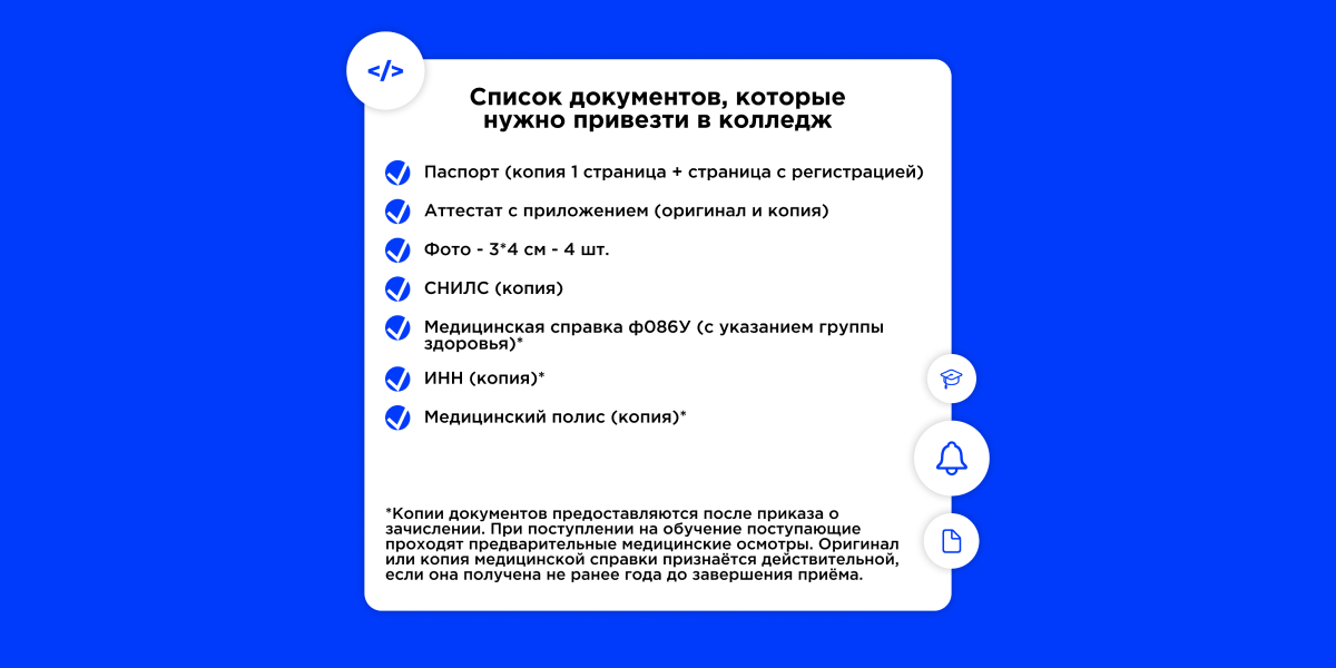 Приёмная комиссия продолжает свою работу. Напоминаем про список документов, необходимых для поступления в колледж.