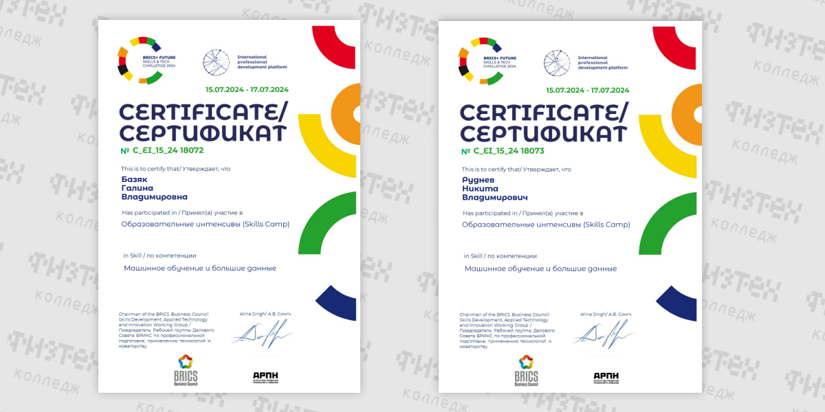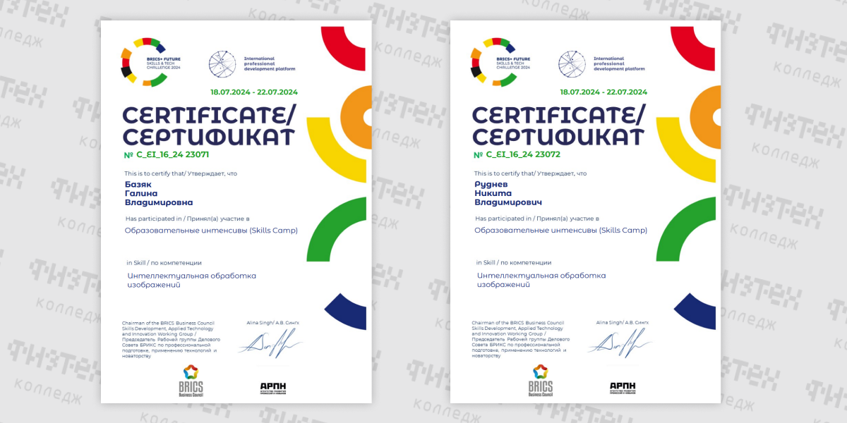 В рамках подготовки к Международному чемпионату по перспективным технологиям и навыкам BRICS Future Skills & Tech Challenge 2024 студент группы ИСП-4-5 Руднев Никита и преподавтель Базяк Г.В. приняли в них участие.
